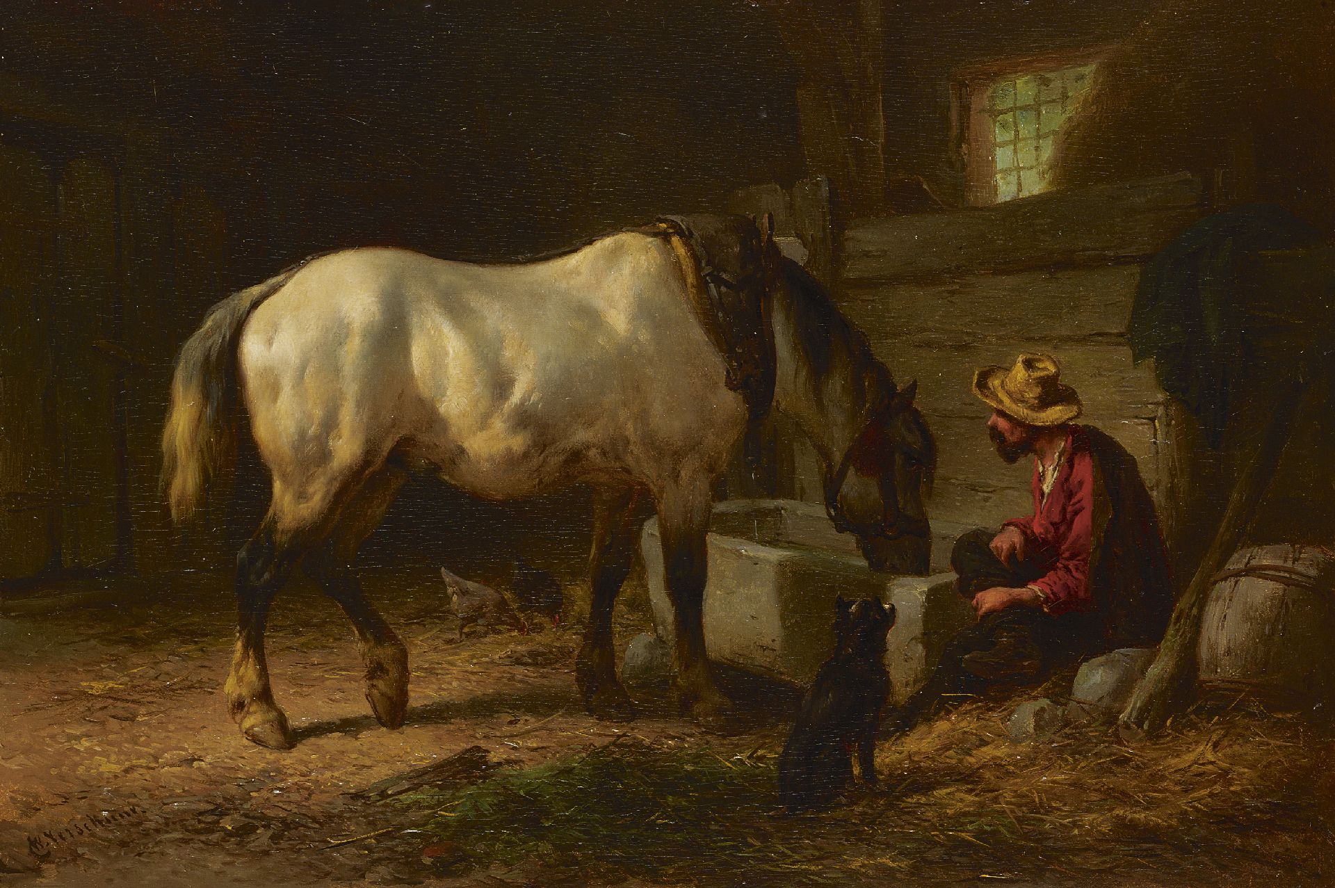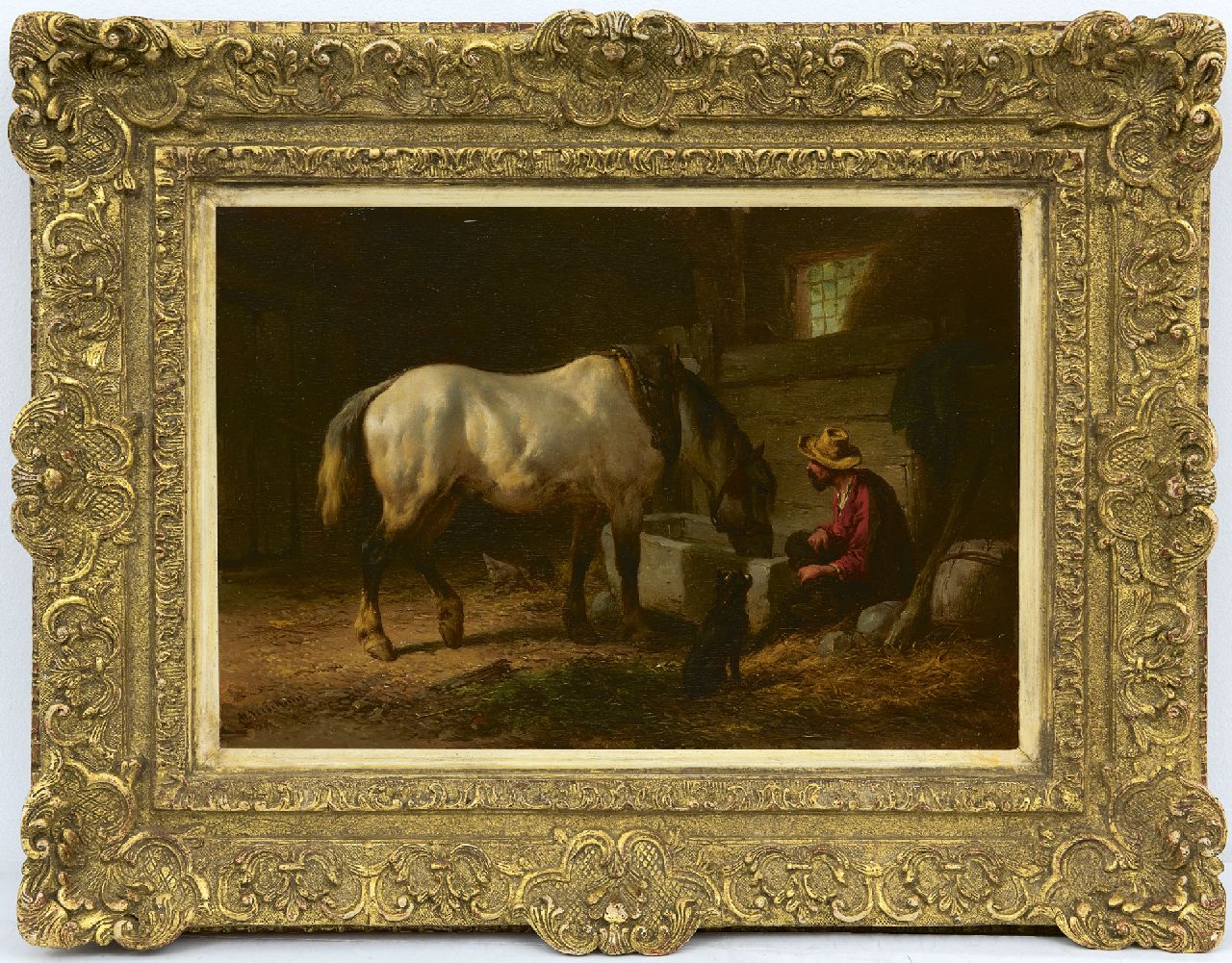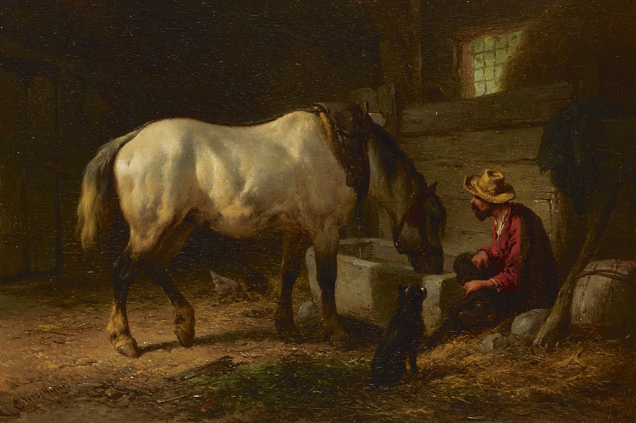 Wouterus Verschuur war zu seiner Zeit schon berühmt als Pferdemaler. Von seinem Lehrmeister, dem Viehmaler P.G. van Os, lernte er den Bau und Bewegungen von Pferden bis zur Perfektion aufzuzeichnen. Als richtiger Romantiker interessierte er sich auch für ihren Charakter. So malte er starke Bauernpferde im Stall, schwanke Reitpferde beim Ritt in der Nachmittagssonne und energische Geschirrpferde. Verschuur war auch ein geschickter Hundemaler. Diese Tiere kommen auf den meisten seiner Gemälde vor. Zwischen 1858 und 1868 wohnte der Maler in Haarlem, wo er Anton Mauve unterrichtete. Auch war er lehrmeister seines Sohnes Wouterus jr. ,der sich ebenso spezialisierte auf Pferde.