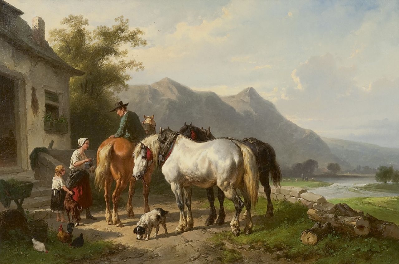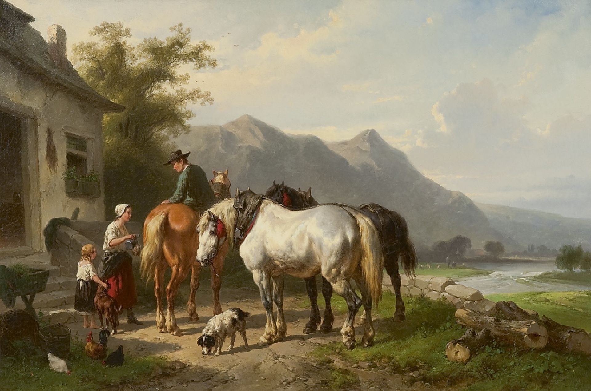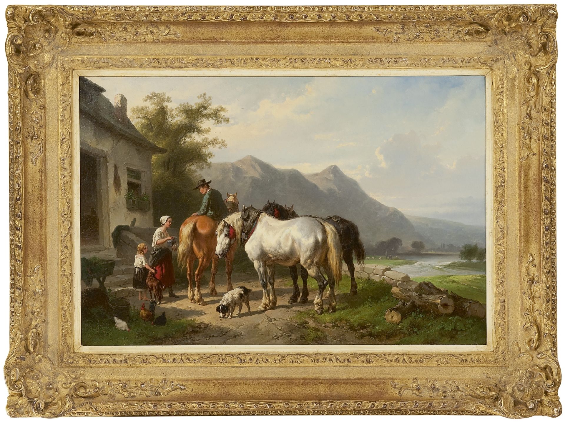 Wouterus Verschuur war zu seiner Zeit schon berühmt als Pferdemaler. Von seinem Lehrmeister, dem Viehmaler P.G. van Os, lernte er den Bau und Bewegungen von Pferden bis zur Perfektion aufzuzeichnen. Als richtiger Romantiker interessierte er sich auch für ihren Charakter. So malte er starke Bauernpferde im Stall, schwanke Reitpferde beim Ritt in der Nachmittagssonne und energische Geschirrpferde. Verschuur war auch ein geschickter Hundemaler. Diese Tiere kommen auf den meisten seiner Gemälde vor. Zwischen 1858 und 1868 wohnte der Maler in Haarlem, wo er Anton Mauve unterrichtete. Auch war er lehrmeister seines Sohnes Wouterus jr. ,der sich ebenso spezialisierte auf Pferde.