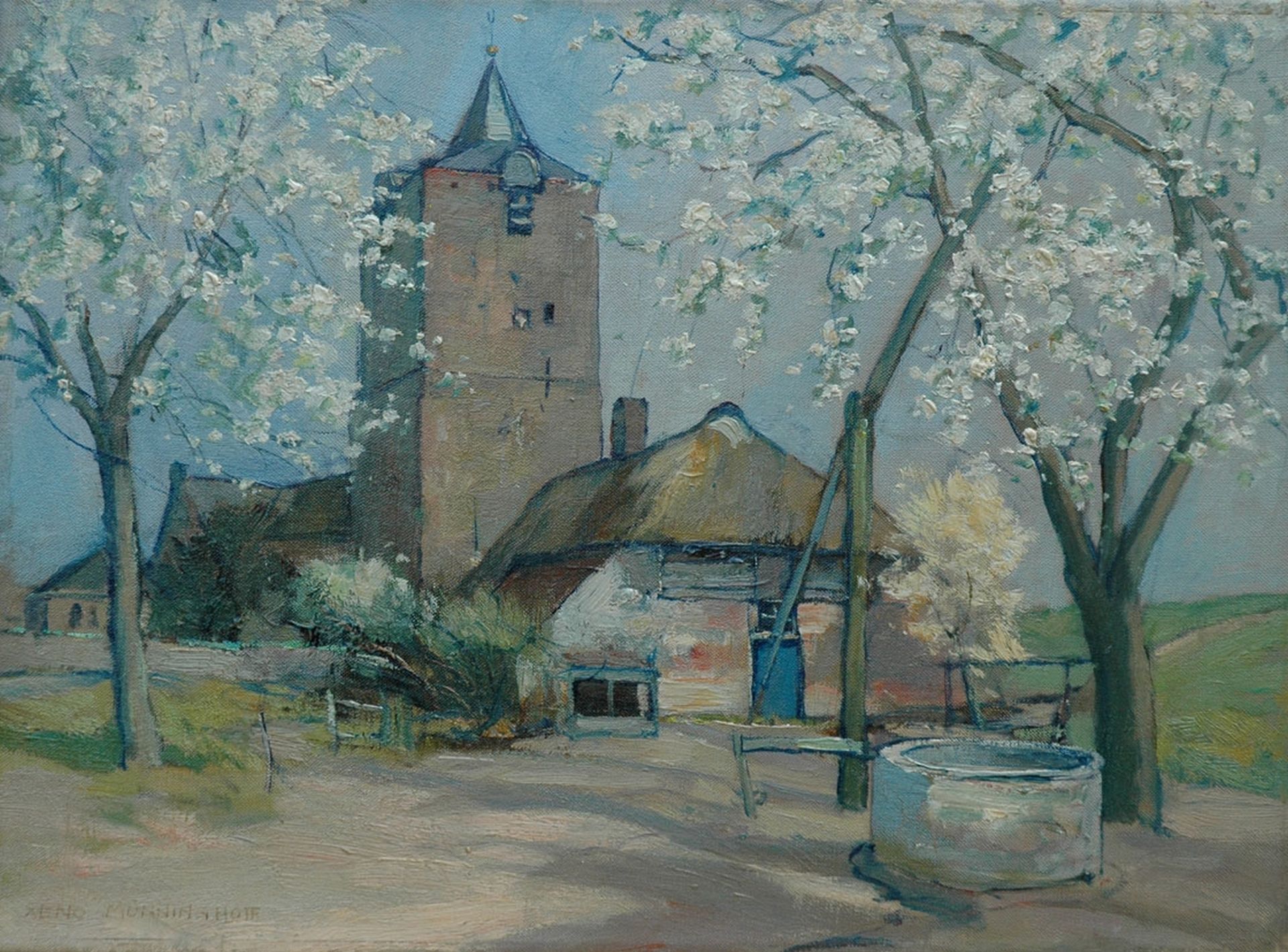 Xeno Münninghoff Kunstwerk • Gemälde • zuvor zu verkaufen Trees in bloom by the church in Dodewaard