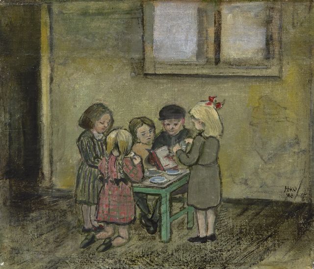 Harm Kamerlingh Onnes | Kinder spielend an einem Tisch, Öl auf Leinwand auf Holz, 19,2 x 22,7 cm, Unterzeichnet M.r. mit Monogramm und datiert '48
