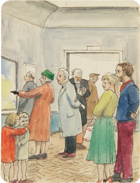 Harm Kamerlingh Onnes | Die Ausstellung (mit dem Maler selbst in der Mitte), Feder und Tinte und Aquarell auf Papier, 13,1 x 10,0 cm, Unterzeichnet auf der Rückseite und zu datieren 1956