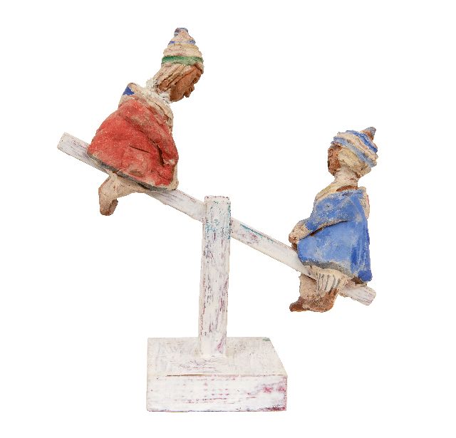 Harm Kamerlingh Onnes | Auf der Wippe, polychrome glazed earthenware, wood, 20,5 x 18,0 cm, Unterzeichnet auf der Unterseite mit Monogramm und datiert '64