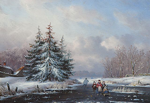 Jan H.B. Koekkoek | A busy day on the ice, Öl auf Holz, 23,5 x 35,5 cm, signed l.r.