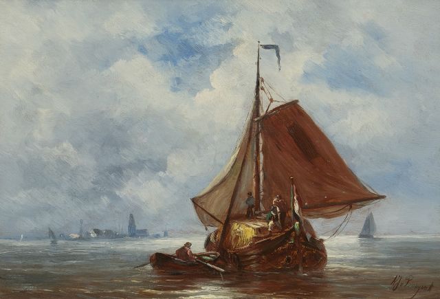 Nicolaas Riegen | A hay ship at sunset, Öl auf Holz, 15,4 x 21,1 cm, signed l.r.