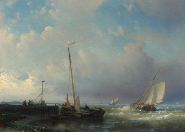 Hermanus Koekkoek | Shipping off a jetty, Öl auf Holz, 11,9 x 14,7 cm, signed l.l. with initials