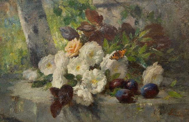 Rosen und Sommerblumen auf dem Waldboden, Öl auf Leinwand 46,3 x 55,1 cm, Unterzeichnet u.l.