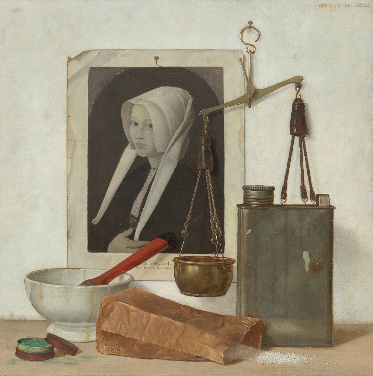 Nachdem sich Gerrit de Jong in den 1930er Jahren für ein Leben als Autodidakt entschieden hatte, wurde sein Talent schnell erkannt. Als er 1940 an der Gruppenausstellung Unsere Kunst von heute im Rijksmuseum teilnahm, erwarb das Museum drei seiner ausgestellten Werke. De Jong bewundert die Präzision alter Meister wie Jan van Eyck und Hendrick Avercamp. In dem abgebildeten Gemälde sehen wir dies in dem Porträt, das wahrscheinlich Agatha van Schoonhoven darstellt, das 1529 von Jan van Scorel (1495-1562) gemalt wurde.
