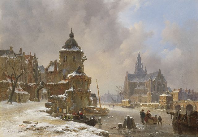 Charles Leickert | Winterstadtbild mit Figuren auf dem Eis, Öl auf Holz, 25,1 x 19,8 cm, Unterzeichnet u.r.