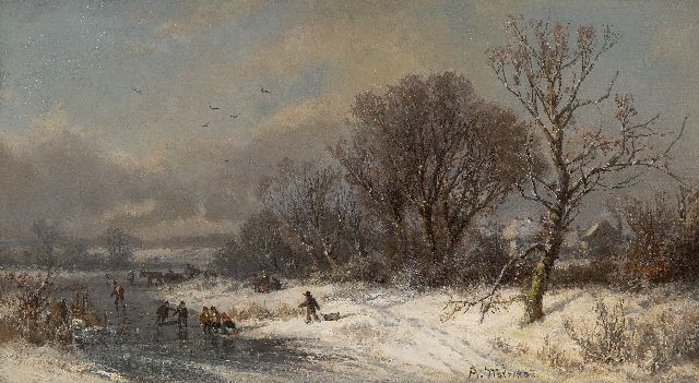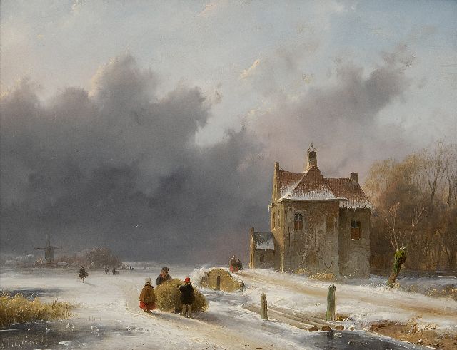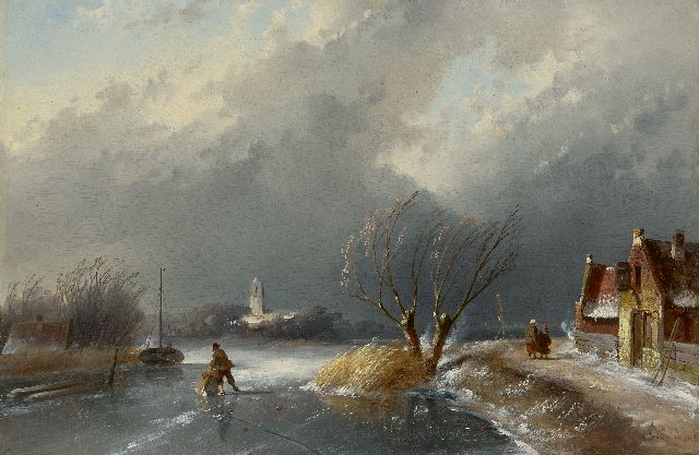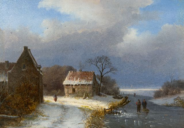 Andreas Schelfhout war einer der bekanntesten Eismaler des frühen 19. Jahrhunderts und wurde von Kritikern als "Claude Lorrain der Winterszenen" gelobt. Niemand übertraf ihn in der Darstellung des tiefschwarzen, reflektierenden Eises, der gezackten Risse und Skatespuren, des Spiels von Licht und Schatten und des hohen, spektakulären bewölkten Himmels. Die raffinierte Ausarbeitung und realistische Details waren auch Gründe für seine Beliebtheit. Schelfhout hatte viele Schüler, darunter Charles Leickert, Nicolaas Roosenboom und Johannes Franciscus Hoppenbrouwers, die ihrem Lehrer in Bezug auf Komposition und Ausarbeitung treu folgten. Bei seinem Schüler J.B. war das ganz anders. Junges Kind. "Skater und Schubschlitten auf gefrorenem Kanal", gemalt 1844, ist eine seiner frühesten Eisszenen und wurde noch immer vollständig von Schelfhout beeinflusst. Zu dieser Zeit arbeitete Jongkind noch im Atelier des Meisters, obwohl er bereits einige Berühmtheit erlangte. Zwei Jahre später, 1846, reiste er nach Frankreich ab. Dort malt er weiterhin niederländische Eisszenen, weil sie bei den Franzosen sehr beliebt sind. Aber Schelfhouts präzise Pinselführung und romantische Komposition sind schwer zu finden. Er tauschte diese gegen die schnellen, lockeren Schläge aus, die ihm den Ruf eines Vorläufers des Impressionismus verleihen würden.
