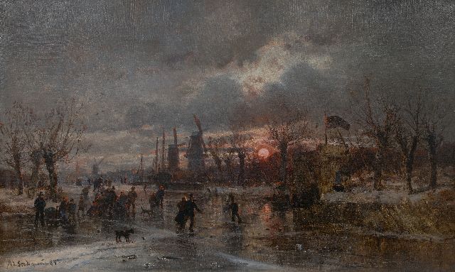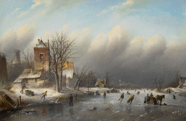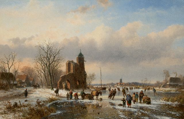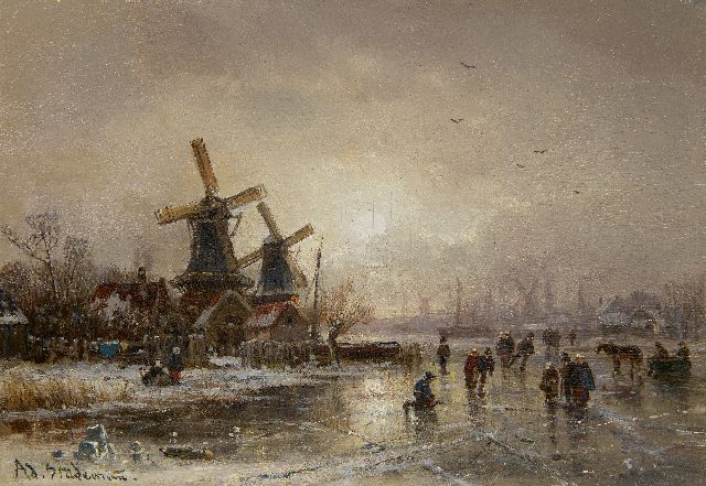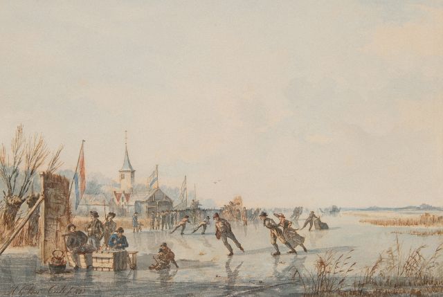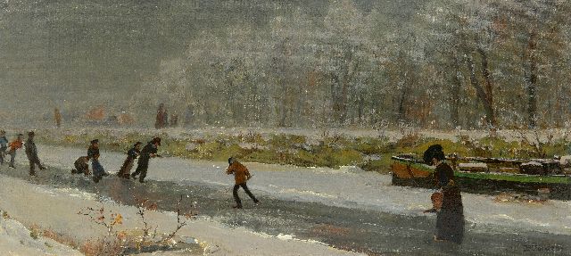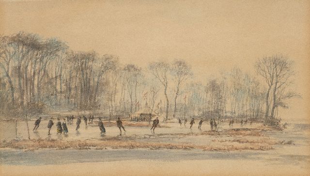 Ein gefrorener Kanal, der ins Unendliche führt, ein Kuchen-Zopi-Zelt, gefrorene Boote und Skater; zusammen zeigen sie die Eisszene so, wie die Leute sie gerne sehen. Bereits im 17. Jahrhundert spezialisierten sich Maler auf Winterlandschaften, die der Käufer als typisch niederländisch erlebte. Hendrick Avercamp wurde berühmt für seine Eisunterhaltung und Skater, für die er in seiner unmittelbaren Umgebung Beispiele fand. Im 19. Jahrhundert, als viele niederländische Künstler bewusst eine Verbindung zur Malerei des 17. Jahrhunderts suchten, war die Eisszene ein beliebtes und weit verbreitetes Genre.