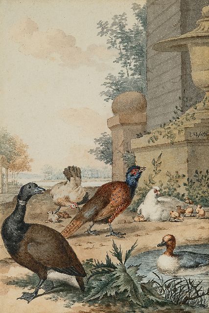Jabez Heenck | Exotische Ente und andere Vögel in einer Parklandschaft, Aquarell auf Papier, 26,5 x 18,1 cm, Unterzeichnet M.r. mit Monogramm und datiert 1776