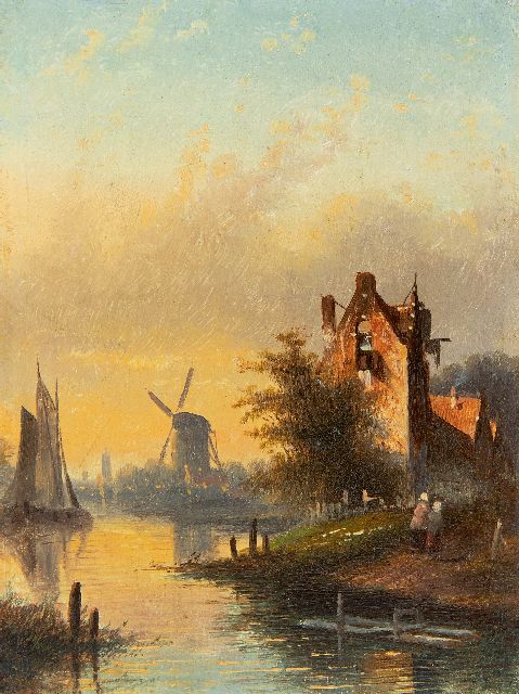 Sommerlandschaft mit Figuren und Mühle am Wasser