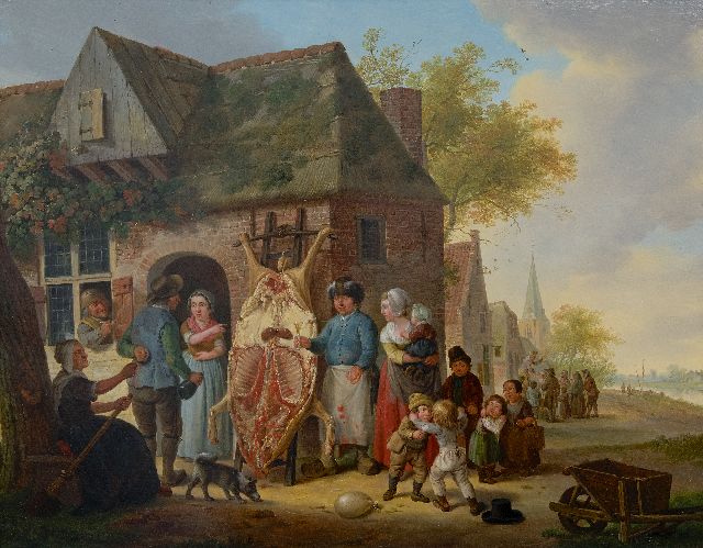 Cornelis van Cuylenburgh (II) | Dorfszene, nach dem Schlachten des Schweins, Öl auf Holz, 49,7 x 64,0 cm, Unterzeichnet m.l. und datiert 1797