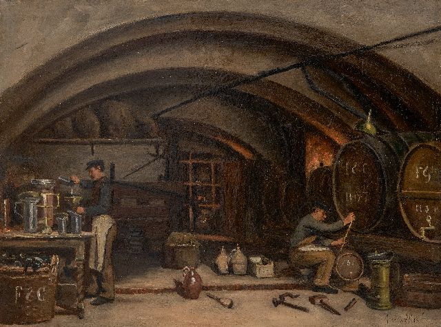 Johannes Franciscus van der Vlis | Blick in den Weinkeller von Finjé & Co. an der Oude Gracht, Utrecht, Öl auf Holz, 39,3 x 50,1 cm, Unterzeichnet u.r. und zu datieren um 1910-1920, ohne Rahmen