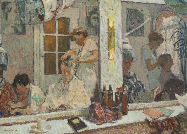 Theo Kurpershoek | Selbstporträt beim Friseur, Öl auf Leinwand, 80,4 x 110,2 cm, Unterzeichnet u.l. und datiert '83