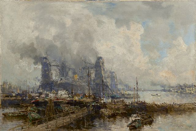 Johan Hendrik van Mastenbroek | Lighters in the Maashaven, Rotterdam, Öl auf Leinwand, 47,4 x 71,2 cm, signed l.r. und dated 1930
