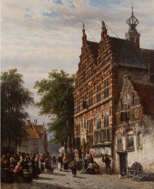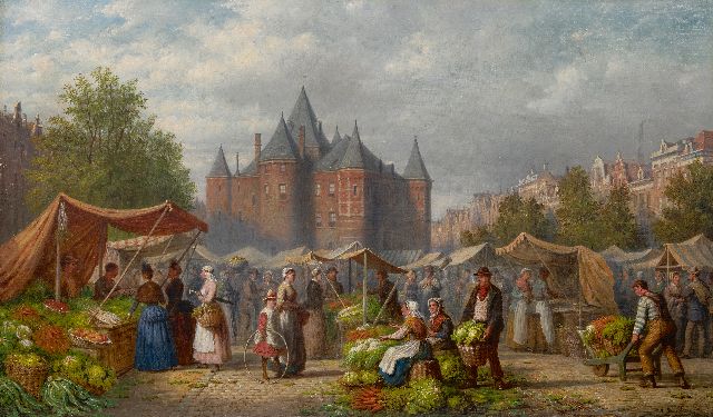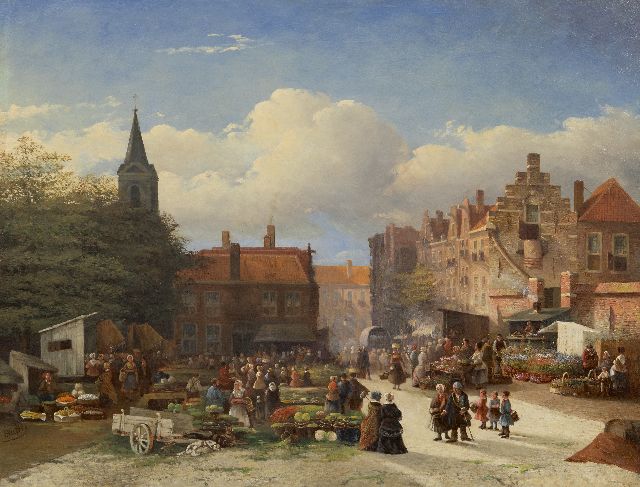 Aussicht auf den Gemüse- und Blumenmarkt in eine alte holländische Stadt