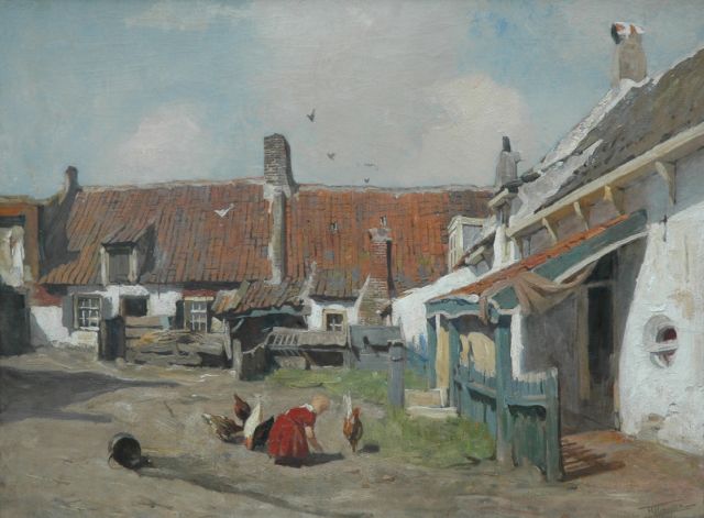 Hendrik Willebrord Jansen | Feeding the chicken, Katwijk-binnen, Öl auf Leinwand, 62,2 x 83,1 cm, signed l.r. + verso