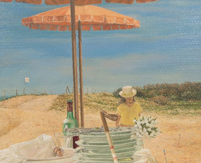 Ewoud de Kat | Sonnenbaden am Strand, Zeeland, Öl auf Leinwand, 13,5 x 35,3 cm