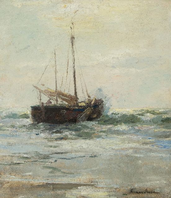 Kees van Waning | 'Bomschiff' vor Anker in der Brandung, Öl auf Leinwand, 25,2 x 31,0 cm, Unterzeichnet u.r.