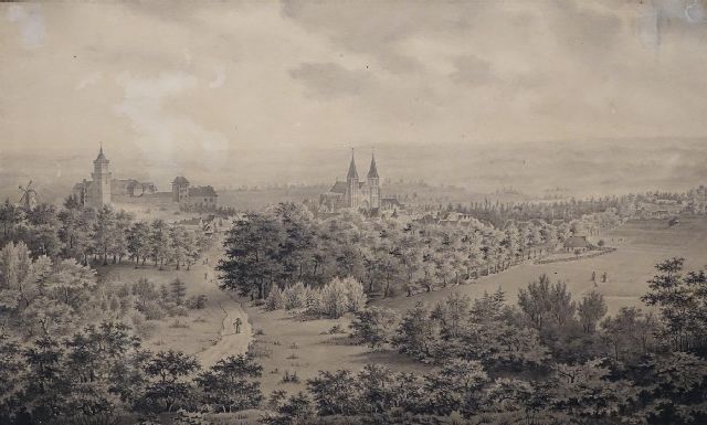 Hollandse School, 19e eeuw | Panoramablick auf die deutsche Stadt Kleve mit dem Schwanenschloss und der Stiftskirche, Tinte auf Papier, 23,1 x 38,2 cm, Unterzeichnet u.r. und datiert 1842