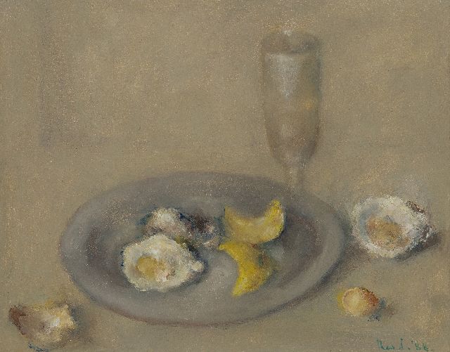 Stillleben mit Austern und Zitronenschalen auf einem Zinnteller