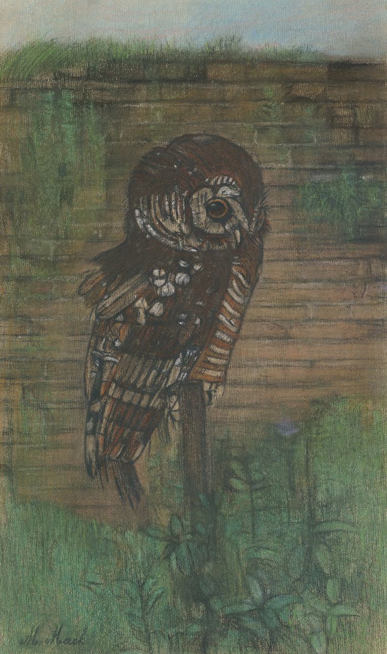 Margaretha Mack | Eule auf einem Stamm, Pastell auf Papier auf Pappe, 49,5 x 30,1 cm, Unterzeichnet u.l.